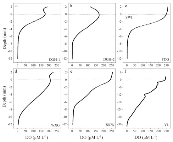 Dissolved oxygen concentration variation in sediment profiles of sampling sites, from June 2019. Dashed lines indicated approximate positions of sediment–water interface (SWI). Note the different Y-axis scaling in YL. (a) DGH-1 (b) DGH-2 (c) FDG (d) WXG (e) XKW (f) YL.
