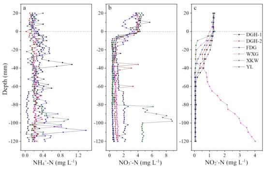 According to Figure 3a, the mean concentration of NH4+-N in each sediment profile ranged from 0.19 to 0.39 mg L−1. NH4+-N concentrations showed no obvious trends throughout the sediment profiles, except in sites YL and FDG. NH4+-N concentrations at YL varied from 0.30 to 0.07 mg L−1 and showed a decreasing trend with sediment depth. In contrast, NH4+-N at site FDG increased with depth and ranged from 0.16 to 1.37 mg L−1. However, extremely high concentrations of NH4+-N occurred at a depth of −36 mm in DGH-1 (1.06 mg L−1) and −96 mm in XKW (0.97 mg L−1), indicating the high heterogeneity between the different profiles.