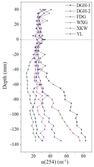 Vertical distribution of UV-Vis spectroscopy absorption coefficient α(254) of sediment pore water in sampling sites. Dashed lines indicated approximated positions of sediment–water interface (SWI).
