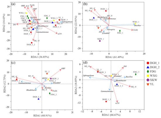Redundancy analysis plot of the relationship among the nitrogen transform bacteria and dominant environmental parameters in sediment cores at 0–9 cm (a), surficial sediment at 0–3 cm (b), intermediate sediment at 3–6 cm (c) and profundal sediment at 6–9 cm (d). Red solid lines indicate major environmental variables. Blue solid lines show the top five bacteria in relative abundance at genus level. Geometric graphs represent the sampling location. (For interpretation of the references to color in this figure legend, the reader is referred to the Web version of this article.).