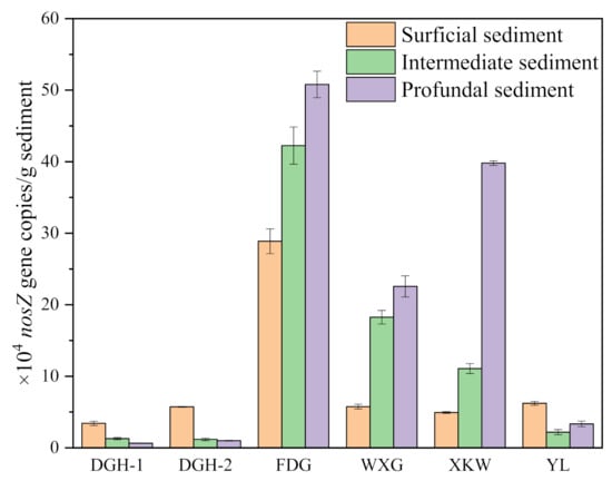 Denitrifiers in sediments were quantified using the quantitative polymerase chain reaction (qPCR) method. NosZ is a gene marker of denitrifiers and was specifically chosen in this study. The qPCR with primer sets targeting nosZ2F and nosZ2R were used for the nosZ genes [43]. The primers and conditions for the qPCR are provided in Table S2 and Table S3. The q-PCR experiments were performed on a ABI7300 qPCR instrument (Applied Biosystems, Foster City, CA, USA) using ChamQ SYBR Color qPCR Master Mix as the signal dye. Each 20 μL reaction mixture contained 2 μL of the template DNA and 16.5 μL of ChamQ SYBR Color qPCR Master Mix. Standard curves for each gene were obtained by the tenfold serial dilution of standard plasmids containing the target functional gene. All operations were followed the MIQE guidelines.