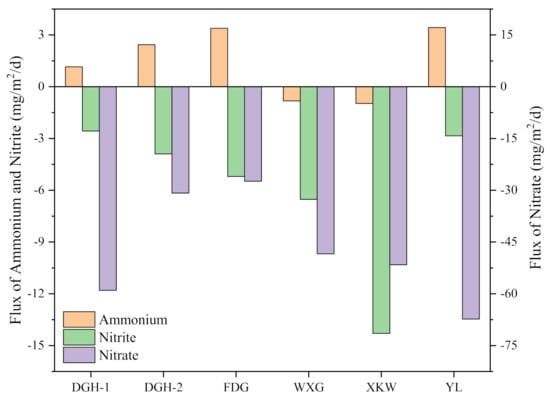 The apparent diffusion fluxes of dissolved inorganic N (DIN) at the SWI were also measured. As shown in Figure 7, the positive value represents the diffusion direction from the sediment to the overlying water, and the negative value represents the diffusion direction from the overlying water to the profundal sediment. The apparent diffusion fluxes of NH4+-N at the SWI ranged from -0.97 to 3.43 mg m−2 d−1. Sites WXG and XKW showed negative values, and we observed an increase in the activity of nitrifying bacteria. In contrast, NH4+-N in the other sites was released from the sediment to the overlying water, which likely provided substrates for algal propagation. The apparent diffusion fluxes of NO3−-N and NO2−-N were all negative, with values at the SWI ranging from −67.31 to −27.38 mg m−2 d−1 and -14.30 to −2.57 mg m−2 d−1, respectively. NH4+-N flux values were higher and NO3−-N and NO2−-N flux values were lower at sites DGH-2 and FDG compared with the other sample sites. The decomposition of algal blooms at the SWI rapidly depleted DO, which would significantly inhibit denitrification in sediment.