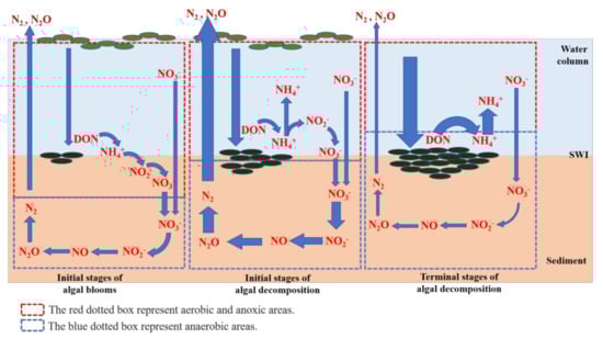 The algal biomass, physicochemical indexes, diversity and abundance of microbial communities, and apparent DIN diffusion fluxes inferred significant differences in the nitrification and denitrification processes. As shown in Figure 8, at sites with low algal biomasses, the high production of DON from the decomposition of algal blooms diffused and transformed into ammonium fractions at the SWI. Under aerobic conditions, most ammonium fractions in the sediments were microbially transformed into NH4+-N, NO2−-N, and NO3−-N via nitrification and denitrification, which then diffused toward the overlying water. At sites with high algal biomasses, the SWI was extremely anaerobic due to the constant accumulation of algal blooms. The algal blooms decomposed superfluous DON, leading to excess NH4+-N, which could not be completely transformed to NO3−-N due to the limited DO concentration. As a result, the sediments became a source rather than a sink of NH4+-N. Denitrification is promoted under anaerobic environments and abundant DOM [52]. If the algal biomass does not increase, the DOM will be rapidly consumed and the SWI conditions will be relieved. In addition, the rapid consumption of NO3−-N promotes the conversion of NH4+-N into NO3−-N, which reduces the diffusion of NH4+-N into the overlying water. Furthermore, the continued increase in algal biomass may alter the biogeochemical cycling of N. In an irreversible situation, the decomposition of large amounts of algal blooms will enhance the anaerobic conditions at the SWI, and the DON-generated NH4+-N is unable to further transform via nitrification. As a result, denitrification is restrained due to the limited availability of NO3−-N fraction. The rate of N cycling will eventually reduce and increase the risk of DON and NH4+-N at the SWI; this would further promote the large-scale occurrence of algal blooms. Zhu et al. [20] also found that DO concentrations (controlled by the concentration of cyanobacteria) at the SWI was the dominant influence on nitrification and denitrification in sediments, which significantly influenced the deposition rates of the different N fractions. Overall, previous studies have identified extremely high N2O release rates under the intensified eutrophication of freshwater ecosystems. Previous investigations found significantly higher N2O emissions in sampling sites with high algal biomasses, which is similar to the findings of this study [53].