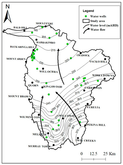 - Magarey, P.; Deane, D. Willochra Basin Groundwater Monitoring Status Report; DWLBC Report 2005/39; Government of South Australia, Department of Water, Land and Biodiversity Conservation: Adelaide, Australia, 2005; p. 50.