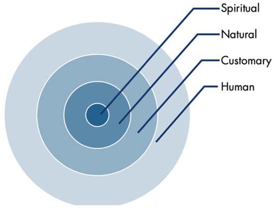 Anishinaabe inaakonigewin is generated from different sources, the understanding and application of, which is a lifelong practice requiring a progression through levels. Each level of law is part of a set of concentric circles sourced in spiritual law and dependent on each other for complete legal understanding (see Figure 1-Sources of Anishinaabe Inaakonigewin (law)). Humans observe the application of spiritual law in the natural environment, as applied by other beings in Creation. Customary law is based on spiritual and natural law. This involves accepting responsibility in relation to our relatives.
