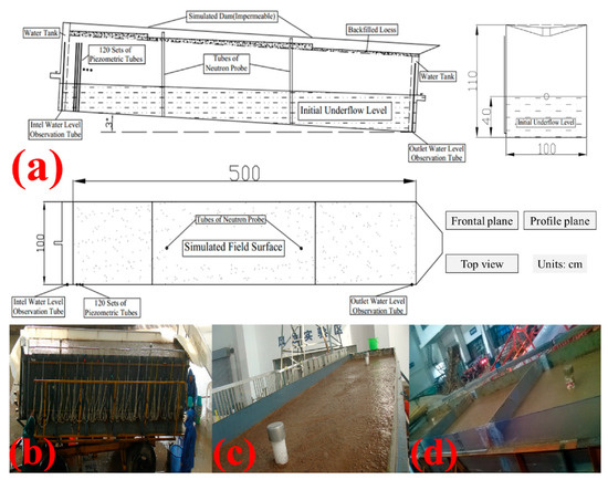The experiments were conducted in the sand-box model [42,43], 5.3 m 1 m 1 m, at the Rainfall Simulation Hall. The slope of the model could be adjusted manually from 0° to 35°. There were two water tanks, 0.15 m 1 m 1 m, in front and back of the model flume, to regulate the underflow level. Above the front side of the water tank, there was one surface water groove, and there was one drainage pipe of groundwater of 0.4 m high at the front side of the water tank (as shown in Supplementary Figure S2b). Moreover, two neutron probes access tubes down to a depth of 0.9 m in experimental flume for soil moisture control (as shown in Supplementary Figure S2a and Figure 2).