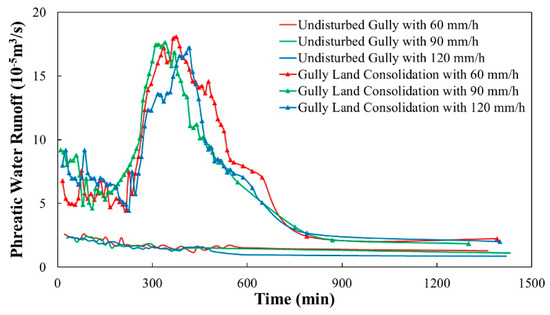 As shown in Figure 5, the phreatic water outflow processes with or without land consolidation treatment are entirely different. The hydrographs are similar under different rainfall intensities with the same gully treatments. Without land consolidation, the phreatic water hydrographs have weak responses to rainfall intensities, and the outflow rate continues to decrease with small fluctuations. Moreover, the magnitude of phreatic water is relatively small. The average phreatic water runoff under three rainfall intensities is 1.85 10−5 m3/s, 1.82 10−5 m3/s, and 1.67 10−5 m3/s. In contrast, the phreatic water hydrographs with GLC have large peaks 6.2 h after the rainfall, and the outflow rate of phreatic water in GLC is 5.39 times that in UG. The average phreatic water runoff under three rainfall intensities is 9.91 10−5 m3/s, 9.67 10−5 m3/s, and 9.21 10−5 m3/s. Meanwhile, we analyzed ratios among three water balance components, including surface runoff, soil water, and phreatic water (see Figure S4 in Supplementary Materials). Obviously, the GLC can adjust the average ratios from 79:9:12 to 40:14:46. The GLC effectively increases the proportion of precipitation transformed to soil water and phreatic water from 21% to 60%. In a word, GLC influenced the interaction mechanism between precipitation and phreatic water, and there was more phreatic water transformed with a long-prolonged time.