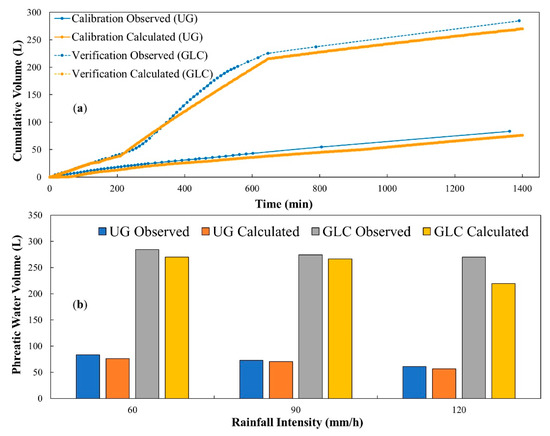 Calibration and verification of HYDRUS-3D. (a) Calibration and verification of UG and GLC under rainfall intensities of 60 mm/h. (b) HYDRUS-3D calibration and verification based on phreatic water volume.