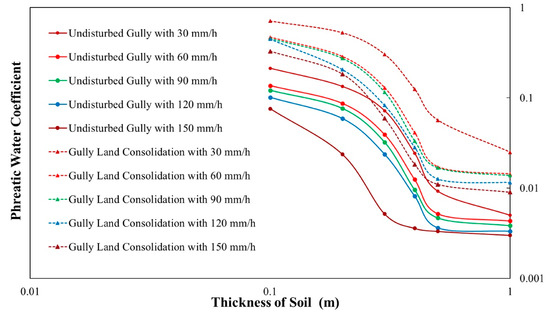 Meanwhile, all curves have a characteristic: the PWC decreases quickly when the soil thickness exceeds 0.4 m, and the average decrease rate per meter of 0.4–0.5 m is 139.3 times that of 0.1–0.4 m. Moreover, the rate of the decrease per meter of GLC with loess thickness of 0.1–0.4 m is 3.87 times that of UG. It also shows that the accumulated runoff caused by GLC further inhibits the phreatic water transformation [40]. The area with thick soil cover and heavy rain is prone to disasters caused by more surface runoff accumulation and the tardy phreatic water transformation, especially in the Loess Plateau, where the loess has low water permeability and is easy to form the physical crust to impede the infiltration process.
