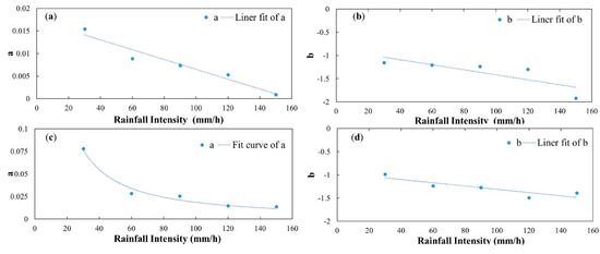 Parameters and change with rainfall intensity. (a) Correlation between parameter and rainfall intensity under UG. (b) Correlation between parameter and rainfall intensity under UG. (c) Correlation between parameter and rainfall intensity under GLC. (d) Correlation between parameter and rainfall intensity under GLC.