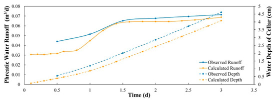 Three days after rainfall of 54.2 mm in August 2019, we conducted a field investigation on this sub-basin. We measured the cellar’s water collection, and about 1.87 10−1 m3 of phreatic water was collected. By inputting the rainfall into the forecasting model above, we calculated the accumulated flow of free infiltration, which is 1.63 10−1 m3. Compared with the actual measurement, the MAPE is 13.1%. Figure 9 depicts the comparison of the phreatic water process between the blind ditch and cellar collecting and compares the observed and simulated water depth of the cellar. By comparing the data at observation time, the MAPE is 9.43%. Later, we counted the average infiltration rate at the junction between the blind ditch and loess (Figure S6 in Supplementary Materials shows the water velocity vector in different simulation periods). It can conclude that the maximum infiltration rate in the loess is 2.88 10−4 m/d, which remains unchanged on the first day after the rainfall stopped. In contrast, the maximum rate in the blind ditch comes on day 1.5, which is 2.1 times that of the loess layer. The maximum drainage transformation efficiency of the blind ditch is 3.2 times that of the loess layer (as shown in Figure S7 in Supplementary Materials). Therefore, the blind ditch could effectively avoid swamping and salinization by increasing the infiltration rate to promote rainfall transformation to phreatic water.