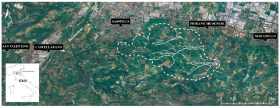 The study area, located on the foothills of the Northern Apennines (Municipality of Fiorano Modenese, Modena Province, Italy) has an extent of about 10 km2 and an elevation ranging from 143 to 308 m a.s.l. (Figure 1). The area is; therefore, a low-hill territory, belonging to the River Secchia catchment. The Torrente Fossa, the main stream channel in the study area, is a right tributary of the River Secchia and flows in a SW–NE direction, collecting the water of its left tributaries, Rio Chianca and Rio delle Salse.
