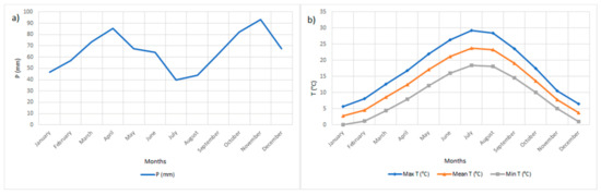 The climate of the area is defined as temperate, a mild temperate climate (Cfa) according to the Köppen classification [104]. An arithmetic mean of climate data for the period 1954–2018, related to three significant stations in the surrounding regions of the study area (San Valentino, Castellarano and Sassuolo cf. Figure 1), are summarised in Table 1. The mean annual rainfall is around 800 mm. Rainfall is concentrated in the spring and autumn months, with a maximum precipitation in November at about 90 mm; conversely, the summer months are hot and dry, with a minimum precipitation in July at only 39 mm (Figure 2a). The mean annual temperature is about 13 °C. In July, the hottest month, the temperature reaches 29 °C in July, the hottest month, and 2 °C in January, the coldest (Figure 2b).