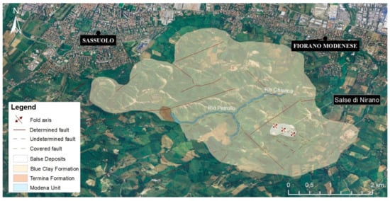From a geological viewpoint, the area is located in the Modena Apennine margin, where the outcropping units reflect the most recent (since the Upper Eocene) geological history of the rising Apennine chain (Figure 3). In particular, marine silty-clayey rock types belonging to the Argille Azzurre Formation (Lower Pliocene–Lower Pleistocene) extensively crop out [105]. They are marly clays, grey and blueish-grey clayey and silty marls, cropping out in medium-to-thin layers, with joints hardly visible owing to bioturbation. Discontinuous, thin, laminated layers of fine biocalcarenites and yellowish siltites are found locally [105,106]. The carbonate content is quite low (25–30%) [107], and the main components are kaolin and montmorillonite [108]. The general setting of the strata shows a NW–SE strike, with an 8°-to-40° NE dip. In the SW part of the study area, the Termina Formation (Tortonian–Lower Messian) crops out. The Termina Formation is composed of greyish clayey marl characterised by undistinguished stratification and by the presence of bioclasts, biosoma and glauconite, intercalated by thin layers of fine sandstone. Continental Quaternary deposits, which belong to the Modena Unit sediments dating from the sixth century CE, crop out along the Torrente Fossa riverbed. This unit comprises gravel deposits turning to alluvial terrace sand and silt deposits [105,106]. Corresponding to the Salse di Nirano Natural Reserve, there are sediments belonging to the emissions of Salse. They are considered Quaternary deposits and are composed of “mud flow” locally complemented by debris related to the upwelling of water and hydrocarbons.