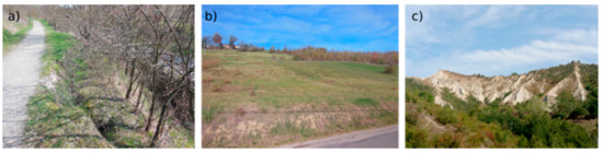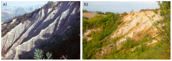 Badlands are deeply and densely dissected accelerated erosional landforms often developed on unconsolidated or poorly cemented materials [1]. They are generally characterised by steep, unvegetated slopes, a high drainage density and high erosion rates. Badlands are similar to miniature fluvial systems, and it is possible to observe interconnections between hillslope processes and landforms [2]. The morphogenesis and evolution of badlands are complex and still under debate. Among the controlling factors suggested in the literature, those indicated as fundamental are as follows: (i) The lithology [3,4] and physical, chemical and mineralogical properties (e.g., sediment size, clay mineralogy, Atterberg’s limits, porosity and pore water chemistry) [5,6]; (ii) climatic factors such as strong seasonal humid/arid contrasts favoured by south-facing slopes [6,7,8,9,10,11]; (iii) the landscape morphology/topography, particularly the slope gradient, orientation and exposure [12]; (iv) anthropic activities such as deforestation for land reclamation, land levelling, cropland abandonment, extensive agriculture and pasture [13,14]. Moreover, badland areas are often characterised by scarce or absent vegetation cover [15,16,17,18,19], related to unfavourable climate conditions, and by the occurrence of mass wasting processes such as slides, earthflows, mudflows and creeping [8,14,20,21].