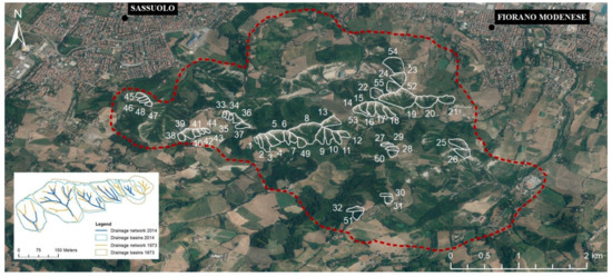 The drainage network in the digitalised basins was reconstructed through the aerial photointerpretation of two pairs of orthophotos from the years 1973 and 2014 that show the most significant changes in the badland area and morphology. The stream network was digitalised in GIS, through manual delineation method; the lengths of the channels (L), the number, and the stream hierarchy were identified; and the following morphometric indices were calculated: The drainage density (D) and the direct bifurcation ratio (Rdb). These indices are related to the characteristics of the hydrographic system and depend on the erosion rate. The D parameter is the sum of the lengths of all the streams and rivers in a drainage basin (ƩL) divided by the total area of the drainage basin (A) [109,110]. The intensification of the precipitation and slope acclivity cause the D to increase. The higher the D, the higher the erosion rate for the ground. The direct bifurcation ratio is the ratio of the number of stream branches of a given order (Ndu) to the number of stream branches of the next higher order (Nu + 1) [109,110,111].
