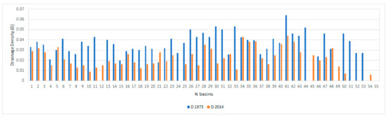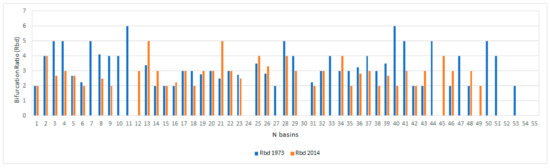 Comparing the values of Rdb in 1973 and in 2014, it can be observed that the Rdb values are generally decreasing, which means that the hydrographic systems are not so articulated and the erosion rate is decreasing. However, in 11 basins (13, 14, 16, 19, 21, 25, 26, 34, 43, 46, and 48), Rbd is increasing, and the values did not change in nine basins (1, 2, 5, 15, 17, 20, 22, 32, and 42).