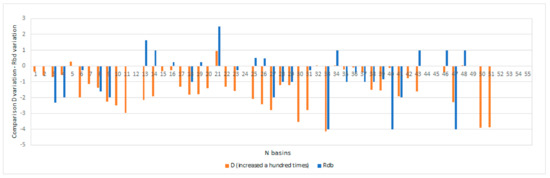 Finally, we evaluated the correlation between the Rbd parameter and the D parameter for both years (the D values increased a hundred times) (Figure 8). Both D and Rdb tended to decrease over time, although with differently distributed values. In particular, only in nine basins (numbers 8, 9, 18, 23, 27, 28, 29, 33, and 41) there was a significant decrease in both D and Rdb; in four basins (numbers 3, 4, 40, and 47), Rdb decreased significantly, unlike D, which showed a limited decrease; in seven basins (numbers 1, 2, 15, 17, 20, 22, and 42), D decreased significantly, but the corresponding Rdb values do not show variations between the two years considered; finally, the increase in Rdb was also related to an increase in D only in three basins, namely, numbers 21, 34, and 48.
