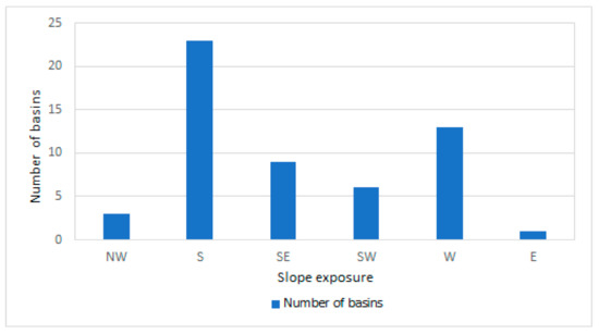 The slope exposure does not seem to have particularly influenced the evolution of the badlands. In fact, 69% of badlands form preferentially on SW and S-facing flanks (135°–225°); of the 11 badlands that show a regression of the upper margin, five basins are exposed to western directions, five to a southern direction and only one to a northern direction (Figure 9). On the other hand, all 10 basins that show a revegetation process are exposed to southern directions.