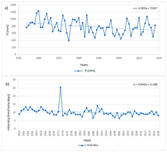 Pluviometric pattern for the study area: (a) Distribution of average annual precipitation during the observation period; (b) annual intensity (mm/rain day).