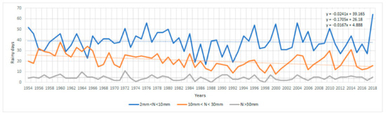 Total annual number of rainy days > 2 mm, > 10 mm and <30 mm, and <30 during 1954–2018.