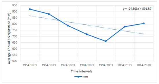 Average annual precipitation over 10-year periods. The average annual precipitation decreases constantly from 921.82 mm/year to 661.56 mm/year (28%) in the period 1954–2003, while a slight increase is recorded in the period 2004–2014.