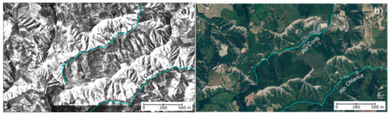 Land use change occurred in a sector of the study area over a 50-year period. (a) IGMI, GAI 1954 aerial photo and (b) orthophotos TeA of 2014. Despite the images’ different resolution, the increase in forest cover and the reduction of agricultural lands are evident.