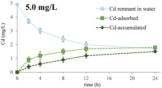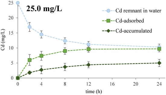 Metal removal (●), adsorption (■), and intracellular accumulation (♦) kinetics in living Oscillatoria sp. during 24-h exposure at 5.0 or 25 mg/L of Cd. Data are mean ± SD of three independent experiments (n = 3).