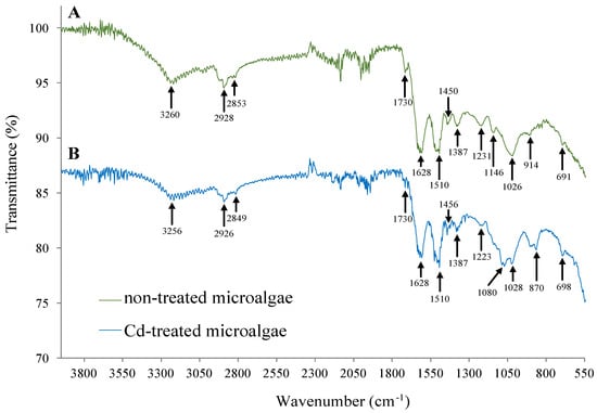 Remarkable differences were observed in the spectra of Oscillatoria biomass obtained with and without Cd treatment (Figure 2). Many peaks in the spectrum of untreated cyanobacterial biomass shifted due to the presence of Cd in the medium. The shifting of peaks indicates that Oscillatoria sp. possess a metal binding ability, indicating the usefulness of this microalgae for treating Cd-containing effluents. In addition, some other bands showed a lower intensity because of the presence of the metal. These changes could be due to the Cd removal by the filamentous microalgae. Therefore, our results proved that different functional groups (mainly anionic ones) present at Oscillatoria sp. biomass such as carboxyl, phosphate, amide, amino, hydroxyl, sulfur, and others play a significant role in Cd adsorption. These results were consistent with related studies on the exposure of different microalgae to toxic metals [,].