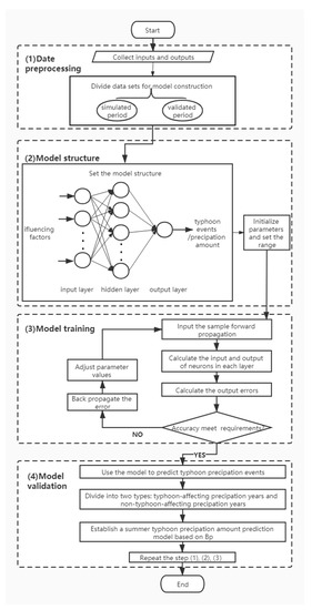 The concept of artificial neuron networks was first proposed in the 1940s. In the late 1980s, after the introduction of back-propagation, the application of BP neural network has been developed [23]. The BP neural network model iteratively back propagates the model errors to update the model parameters. One advantage of the BP neural network is its universal approximator capability in learning continuous functions with any desired degree of accuracy. BP neural network also has the characteristics of clear concept and strong nonlinear mapping ability [24,25]. It has become the preferred prediction method in hydrology and hydrometeorology. Here, the lagged influencing factors affecting summer typhoon precipitation events (and amount) in Anhui Province are used as inputs for the BP neural network model. Typhoon precipitation events (and amount) are used as outputs to establish an Anhui summer typhoon precipitation events (and amount) prediction model. Figure 1 illustrates the flowchart of the proposed method, and each step is described as follows. It mainly includes 4 steps: