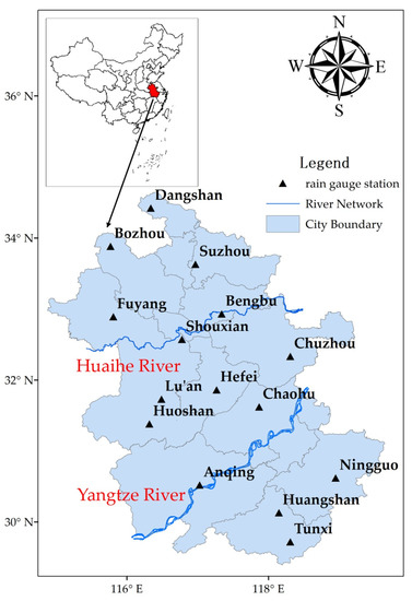 Anhui Province is a provincial administrative region of China (from 114°54′ to 119°37′ E to 29°41′–34°38′ N), located in East China. It covers an area of 140,100 km2. China’s two major waterways, the Yangtze River and Huai River, flow through Anhui, as shown in Figure 2. Taking the dividing ridge of Yangtze River basin and Huai River basin as a dividing line, Anhui Province is divided into two parts. The north part is located at the southern edge of the North China Plain, and the south part is located at the Middle and Lower Yangtze Valley Plain. The study area contains 15 rain gauge stations, namely, Dangshan, Bozhou, Suzhou, Fuyang, Shouxian, Bengbu, Chuzhou, Lu’an, Huoshan, Hefei, Chaohu, Anqing, Ningguo, Tunxi, and Huangshan rain gauge station.