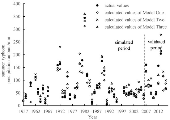 It can be seen from Table 4 that the average relative error of Model One, Model Two, and Model Three during the validation period are 30.5%, 22.1%, and 14.3%, respectively; their average absolute errors are 38.0 mm, 22.8 mm, and 14.7 mm, respectively; their maximum absolute values of relative error are 52.6%, 46.6%, and 33.2%, respectively; and their minimum absolute values of relative error are 3.1%, 5.2%, and 1.8%, respectively. Furthermore, we can see from Table 4 that the prediction errors in 2009 and 2012 are relatively large in Model Three. According to the statistical analysis of typhoon events in 2009 [43], its event-based typhoon precipitation is 41% lower than the average event-based typhoon precipitation of normal years. The total typhoon precipitation of 2009 is 36% lower than the average typhoon precipitation of normal years. The prediction errors in 2009 are caused by the significant cloud structure asymmetry, i.e., the precipitation range brought by landing typhoon is relatively small.