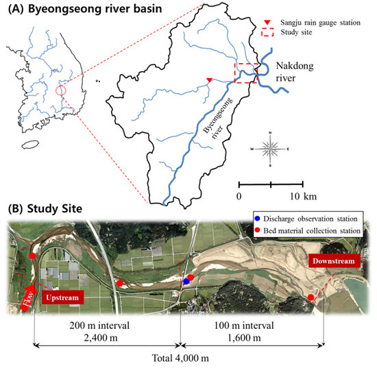 Study area: (A) Byeongseong river basin, (B) study site of the Byeongseong river and cross-section intervals.