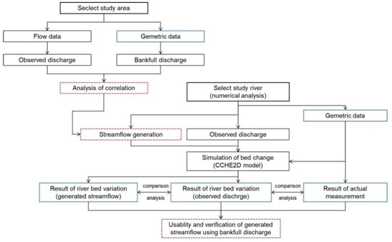 Figure 2 shows the flow chart outlining the research processes. The research was performed by estimating a bankfull discharge by analyzing the bankfull indicators in the target stream. The total annual discharge was estimated by the relation with the bankfull discharge. We generated annual time series flow scenarios for each month and compared the measured discharge. Then, the corresponding bed change simulation results for each scenario were compared with the surveyed bed change data. By comparing the simulating results of bed change for each scenario with the measured, we proposed the stream flow generation for simulating yearly bed change at an ungauged stream in Monsoon region (Figure 3).