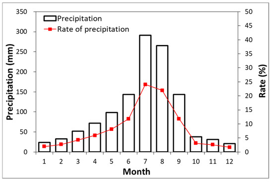 Monthly precipitation and rate of precipitation in Sangju Rainfall Station (1981–2013) (Gyeongsangbuk-Do, 2011).