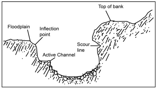 Figure 4 shows the geomorphic bankfull indicators proposed by McCandless [37], which were applied for identifying bankfull cross-section in the present study. The five main geomorphic bankfull indicators are as follows: floodplain break, inflection point, scour line, depositional bench (active channel), and point bar. For estimating the bankfull discharge, one method is based on the stage-discharge curve by confirming the water stage corresponding to the bankfull indicator and another method conducts a numerical simulation using the hydraulic-geometric data in accordance with the water stage corresponding to the bankfull indicator [39]. Accordingly, the discharge at each section that flows up to the water stage corresponding bankfull indicator was presented as bankfull discharge by the Hydrologic Engineering Center’s River Analysis System (HEC-RAS) model, one-dimensional numerical model, using the water stage corresponding to the bankfull indicator and the cross-section data (Table 1). The bankfull discharges for each section of the Byeongseong river were estimated to vary between a minimum of 20 m3/s and a maximum of 150 m3/s, and the averaged bankfull discharge of the target reach was 77.50 m3/s.