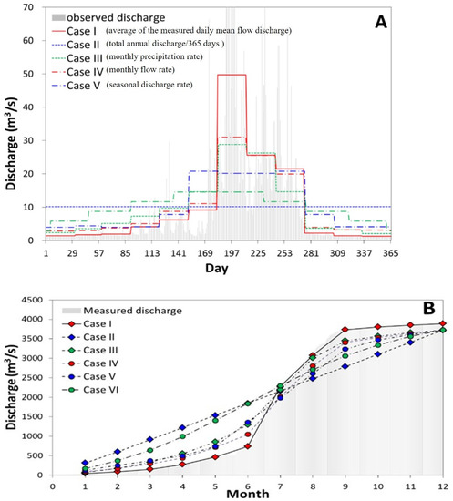 Table 3 shows the daily mean flow discharge of each month for each scenario and shows the RMSE (root mean square error) with measured flow discharge. The RMSE for case I was 7.89 m3/s and the generated stream flow of the present study was the most similar to the measured flow. The RMSEs for case IV and case III were 9.06 m3/s and 9.52 m3/s, respectively. The RMSEs for case II, case VI, and case V were 14.80 m3/s, 13.16 m3/s, and 10.65 m3/s, respectively.