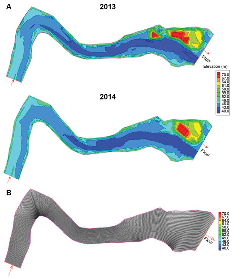 The bed change of the 4 km target reach of the Byeongseong river surveyed in 2013 and 2014 was simulated with the measured inputs of stream flow and channel geomorphic terrain, as shown in Figure 7. The mesh comprised 13,365 nodes at a transverse interval of 20 m and a longitudinal interval of 10 m. For the simulation of the river bed change in the study area, the monitoring data were used twice in 2013 and 2014. The sedimentation pattern generally occurred at 4 km of the target section due to the change of the river bed for one year from 2013 to 2014, and sedimentation occurred at the end of the maximum curve and at the local part at the downstream, and erosion occurred inside the water culvert at 2 km, which was confirmed to have changed into a stable river bed without irregularities overall.