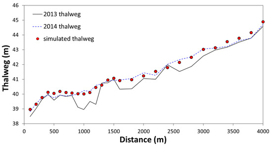 The numerical simulation result of the bed change using the surveyed bed data and the measured discharge in 2013 and 2014 is shown in Figure 8. The simulation results of bed change along thalweg using the measured discharge were similar with the surveyed in 2014. The RMSE, MBE (mean bias error), and MAPE (mean absolute percentage error) were found to be 0.18 m, 0.05 m and 0.36%, respectively. The result of the bed change simulation after calibrating the CCHE2D model parameters coincided well with the characteristics of the bed change in the surveyed bed. It can be seen that the riverbed elevation has deposited in 2014 compared to the riverbed change in 2013. The sediment diameter of the particle was small, so the bed change (erosion and deposition) occurred actively, but it is believed that the riverbed stabilization has progressed since 2014.