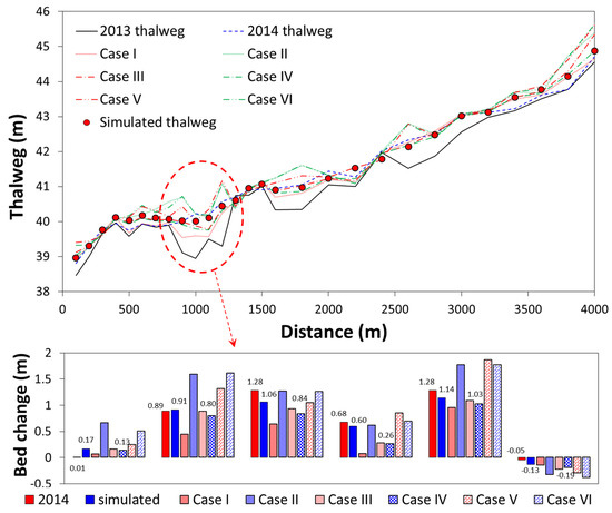 Table 5 shows the RMSE, MBE, and MAPE of the bed changes at the 28 cross sections along thalweg between the surveyed and the simulation results of the six simulation stream flow scenarios. The stream flow scenario that most appropriately simulated the characteristics of the bed change was case IV, the RMSE, MBE, and MAPE are 0.21 m, −0.01 m, and 0.40%, respectively. Thus, the apportioning method of generating the stream flow using the percentage of flow at the gauging station in the nearby surrounding river is most appropriate. The RMSE, MBE, and MAPE of the bed change along thalweg between the surveyed and the measured for case III were 0.25 m and 0.04 m and 0.44%, respectively, which were similar to those of case IV. Therefore, the apportioning method of generating the stream flow using the monthly precipitation percentage of the rainfall station in the target stream basin also simulated river bed well, which was confirmed applicable as an alternative. Furthermore, the flow in a flood season is found to be close to the bankfull discharge in cases III and IV that governs the bed formation because a relatively large flow occurred in this season.