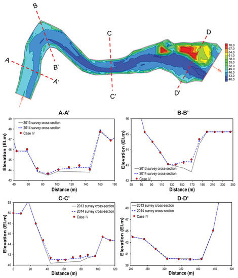 Figure 10 shows the bed change aspect of case IV, which most appropriately simulated the change along thalweg on the representative cross sections, was comparatively analyzed with the surveyed cross-section data. The representative cross sections were selected at 4 points. A-A’ was an upstream point, B-B’ was the point of highest curvature, C-C’ was a midstream point, and D-D’ was a downstream point. The result of the bed-change simulation using the case IV scenario well reproduced the sediment aspects of the study reach. The RMSEs and MBEs between the measured and the simulated of the cross-section A-A’, B-B’, C-C’, and D-D’ were 0.086 m and 0.017 m, 0.041 m and 0.007 m, 0.120 m and 0.040 m, and 0.037 m and −0.003 m, respectively. The prediction of yearly bed change using the daily mean flow for each month by apportioning the total annual discharge estimated using the total monthly discharge percentage of an adjacent stream well simulated the longitudinal and transverse bed changes.