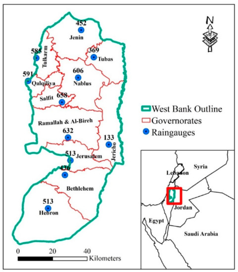 The study area is the West Bank with a total surface area of 5658 Km2 [35]. Administratively, the West Bank is divided into 11 governorates; Salfit, Jenin, Tubas, Nablus, Jericho, Hebron, Tulkarm, Qalqiliya, Jerusalem, Bethlehem, and Ramallah and Al-Bireh (see Figure 1). However, the total population in the West Bank is nearly 2.88 million [36]. The surface elevation of the West Bank ranges between 410 m below mean sea level (msl) in the Dead Sea and 1022 m above (msl) in Tall Asur in Hebron [37]. Mediterranean climate is prevailing in the West Bank, which is characterized as hot and dry in summer and wet and cold in winter [37]. The West Bank rainy season usually extends over 8 months from October to May and most of the West Bank rainfalls (80%) in winter (December to February) [38,39]. Moreover, the rainfall in the West Bank is characterized by high temporal and spatial variation. The long-term annual average varies between 133 mm in the proximity of the Jordan River (in Jericho) to 658 mm in the central mountains (in Salfit) with an annual average value of about 420 mm for the entire West Bank (see Figure 1).