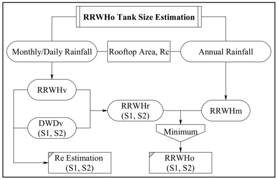 As mentioned earlier, there are different approaches to estimate the optimal RRWHo tank size. In this study, the required tank size (RRWHr) was estimated based on the continuous mass balance approach as presented by Rippl [27].