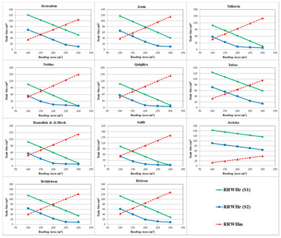 From Figure 4, it is noticed that the RRWHo values for S1 (annual) are more than the RRWHo values for S2 (rainy). This can be attributed to the highly cumulative differences between DWDV and RRWHV. For the S1 scenario, in the governorates of Tulkarm, Nablus, Qalqiliya, Hebron, and Ramallah and Al-Bireh, the RRWHr tank size exceeds the RRWHm tank size for the rooftop areas of less than 150 m2 (RRWHo equals RRWHm). However, RRWHr tank sizes are less than the RRWHm tank size in Jenin and Bethlehem for the rooftop areas of more than 200 m2 (RRWHo equals RRWHr).
