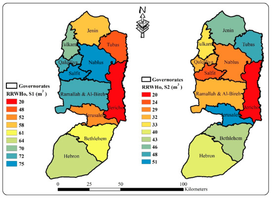 For the average rooftop area of 150 m2, the spatial variation of RRWHo tank sizes for the different governorates for S1 and S2 are presented in Figure 5. From the figure, it is clear that the minimum value of RRWHo (20 m3, in Jericho) and for S1 and S2 scenarios. Whereas, the maximum value of RRWHo (75 m3, in Salfit and Nablus) and (51 m3, in Jerusalem) for S1 and S2 scenarios, respectively.