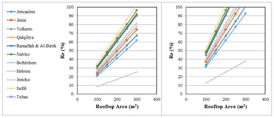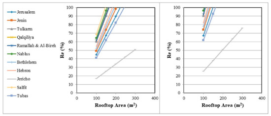 Figure 6 presents the variation of Re for the S1 and S2 and different rooftop areas. Generally, the Re values increase as the rooftop area increases. This can be attributed to the increased values of the estimated RRWHV. It is also noticed that for a rooftop area of 150 m2, the maximum value of Re is in Salfit governorate and the minimum one in Jericho for both scenarios. Accordingly, Re in Salfit is 52% and 77% for S1 and S2, respectively. While in Jericho, Re equals 13% for S1 and 19% for S2.