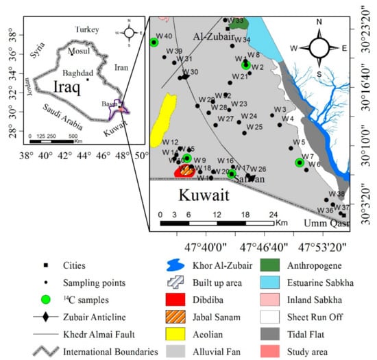 - Khwedim, K.; Schneider, M.; Ameen, N.; Abdulameer, A.; Winkler, A. The Dibdibba aquifer system at Safwan–Zubair area, southern Iraq, hydrogeology and environmental situation. Environ. Earth Sci. 2017, 76, 155. [Google Scholar] [CrossRef]
