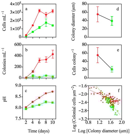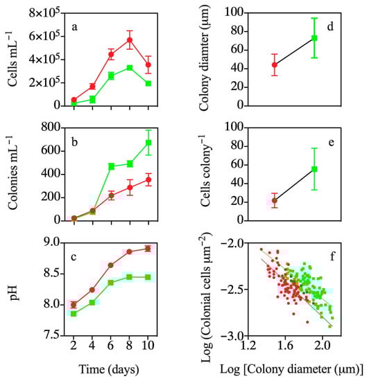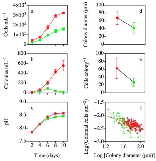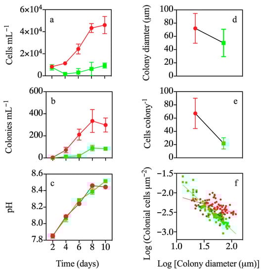 The average colony diameters and cells per colony were 31% and 68% lower compared to the control, respectively (p < 0.01; Figure 3d,e). We found a negative linear relationship between Log (colonial cells µm−2) and Log [colony diameter (µm)] for colonies in the control and treatment (p < 0.01; Figure 3f). The absolute value of the slope of the regression line in the control was lower than that of the treatment (p < 0.01; Figure 3f).