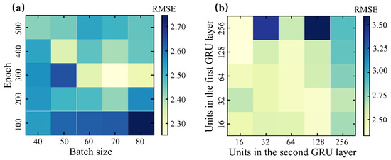 As for the GRU model, there are four important hyperparameters that need to be optimized: (1) Batch size (ranges from 40 to 80, with an increment of 10); (2) epoch (ranges from 100 to 500, with an increment of 100); (3) units in the first GRU layer (i.e., 16, 32, 64, 128, and 256); (4) units in the second GRU layer (i.e., 16, 32, 64, 128, and 256). As the first step, the batch size and epoch have been chosen for the grid search, as shown in Figure 2a. The deeper the blue color, the larger the root-mean-square error (RMSE). As such, the middle right area shows higher accuracy. When the batch size and epoch are set to 70 and 300, respectively, the model achieves the lowest RMSE. As the second step, the hyperparameters of the units in the first and second GRU layers are searched, as shown in Figure 2b. The influence of the units of the GRU layers on the model accuracy is greater than those of the batch size and epoch. The results show that the GRU model does not behave well when the numbers of units for both first and second GRU layers are set to 256. Inversely, the lower left area shows higher accuracy. When the number of units in the first layer is set to 128 and that in the second layer is set to 16, the RMSE is lowest.