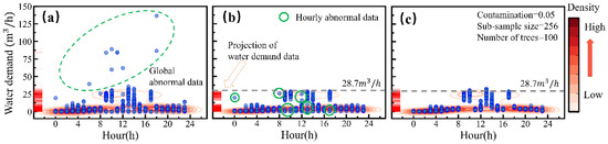 where h(x) is the number of edges that a point traverses from the root node until the traversal is terminated at an external node in the isolation tree, which is also called the “path length”; is the expected path length of point in all the isolation trees; n is the number of instances; and is the average path length of n given points. The threshold of the abnormal score is determined by the contamination level of anomalies. In this study, the contamination level of the water demand data is unknown. Hence, it needs to be determined by trial and error.